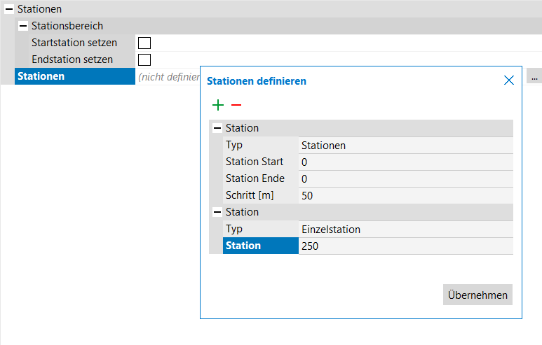 Stationen | Über … öffnet sich ein Dialog zum Definieren des Typs der Stationen. Es können eine einzelne zusätzliche Station bzw. gleich mehrere in bestimmten Abständen eingestellt werden. |