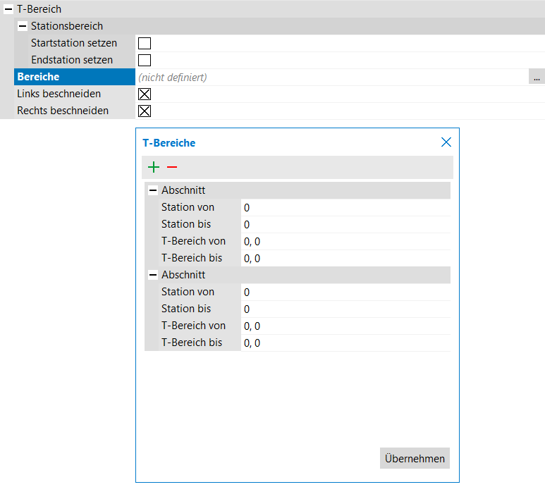 Bereiche | Über … öffnet sich ein Dialog zum Einstellen des/der T-Bereichs(e). |