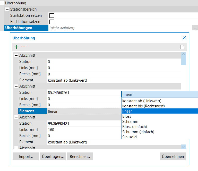 Überhöhungen | Wert der Überhöhung in mm. Die Überhöhung gibt die Differenz der rechten Schienenoberkante zur Gradientenhöhe je Gleis an. Sie ist vorzeichenbehaftet und führt zur Rotation des Gleiskörpers um den Gradientenpunkt im Querprofil des betreffenden Gleises. Die Überhöhungen können importiert, übertragen oder über Berechnen direkt im Markendialog eingestellt und übernommen werden. |