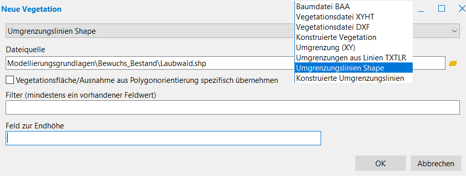 Wenn Sie Einzelvegetationen über Vegetationsdateien importieren, werden automatisch alle Vegetationstypen importiert. Diesen müssen Sie lediglich noch ein Vegetationsmodell zuweisen.