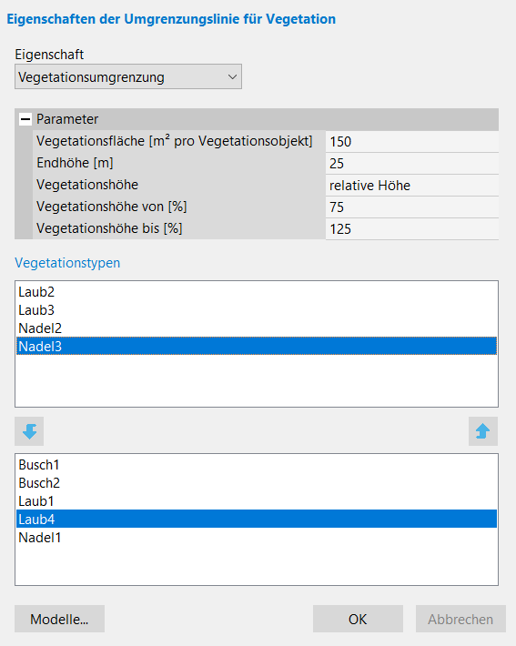 Modelle | Durch Drücken gelangen Sie in die Definition von Vegetationstypen und Zuordnungen zu Vegetationsmodellen des Vegetationsobjekts. |