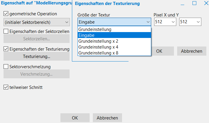 Eigenschaften der Texturierung | Im Bereich des Eigenschaftsgebiets wird die Texturauflösung vergröbert oder verfeinert. Diese Operation ist analog zur Operation “Eigenschaften der Sektorzellen”. Eine Verfeinerung führt zu einer detaillierten texturierten Oberfläche des zukünftigen DGM, jedoch auch zu einem höheren Rechenaufwand und zu einer Reduktion der Performance in KorFin®. Sie sollten daher Verfeinerungen mit Vorsicht definieren. | |