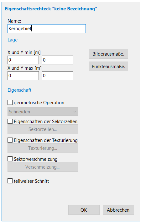 Der Unterschied zum Menüpunkt “Eigenschaftsrechteck…” besteht lediglich darin, dass hier die Ausdehnung vom Daten- oder Modellobjekt bereits definiert ist. Wird beispielsweise ein Luftbild gewählt und von ihm ein Eigenschaftsrechteck generiert, besitzt es automatisch dessen Ausdehnung. Aus allen Datenobjekten können Eigenschaftsrechtecke sowohl von Bilddaten, als auch von Punktdaten und anderen existierenden Eigenschaftsgebieten abgeleitet werden.
