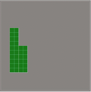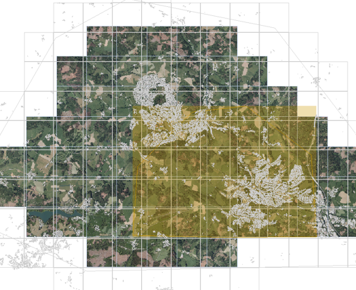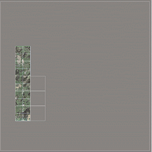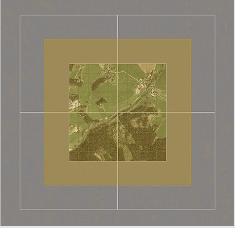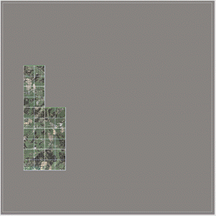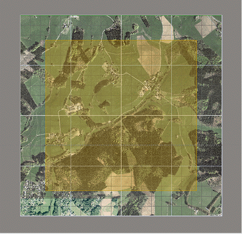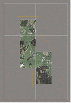Hinzufügen | Fügt betreffende Sektoren dem DGM wieder hinzu. Demnach erhält man bei folgender Ausgangslage folgendes Ergebnis: Als Ausgangspunkt dienen bereits geschnittene Sektoren (über ein Eigenschaftsrechteck “schneiden”). Das weitere Eigenschaftsrechteck mit der Eigenschaft “Hinzufügen” wählt dann die fehlenden Sektoren aus, fügt sie wieder hinzu und führt so zur vollständigen Auswahl aller Sektoren mit Orthophotos. Das zu erstellende 3D-Modell enthält genau den Bereich mit Orthophotos, da der graue Bereich nicht zum 3D-Modell gehört. | |